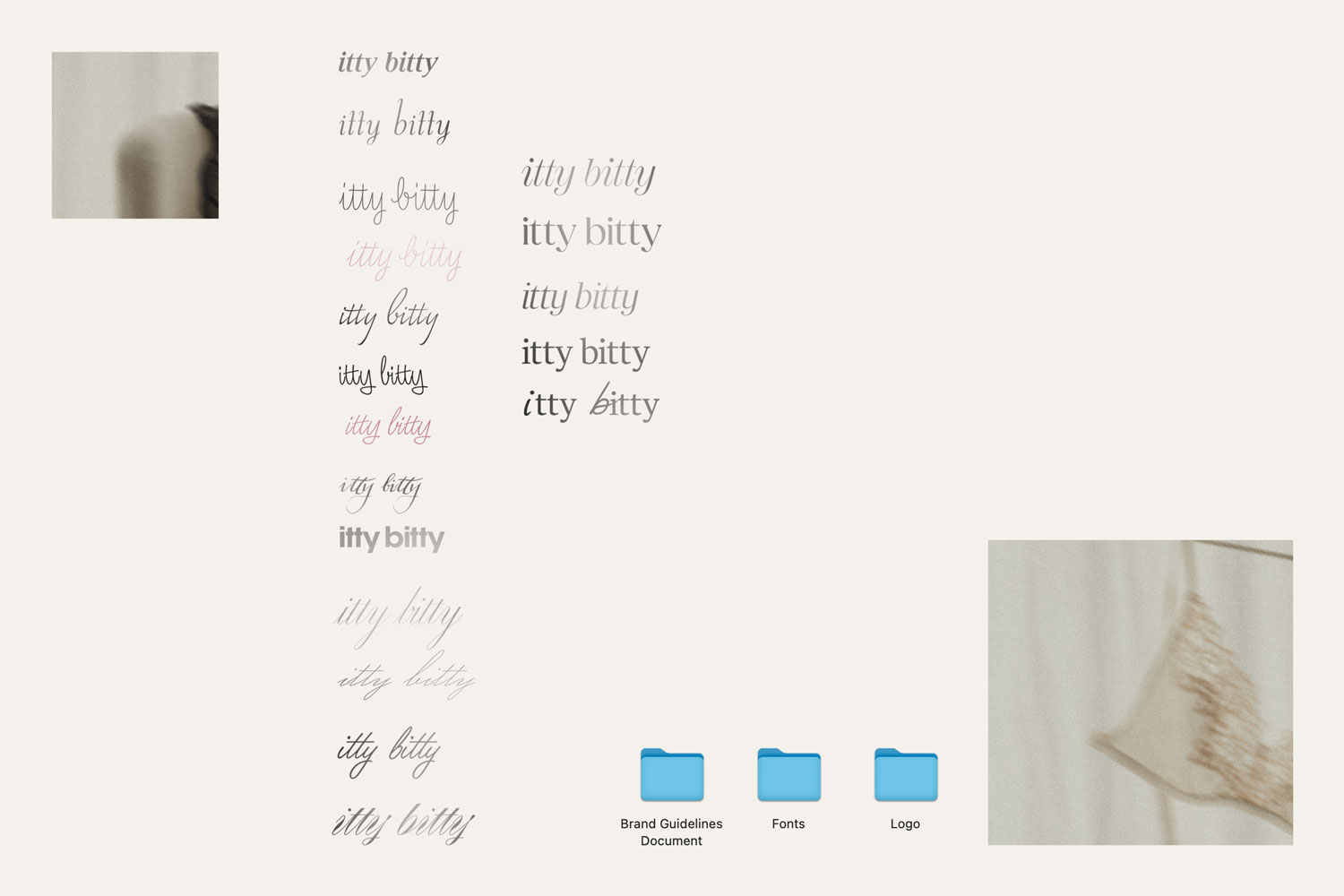 Starting from moodboards and client input, several logo directions were explored. Each leaned into hand-drawn qualities and balancing simplicity with personality. The client chose a fully custom handwritten logomark that feels personal and distinctive.
